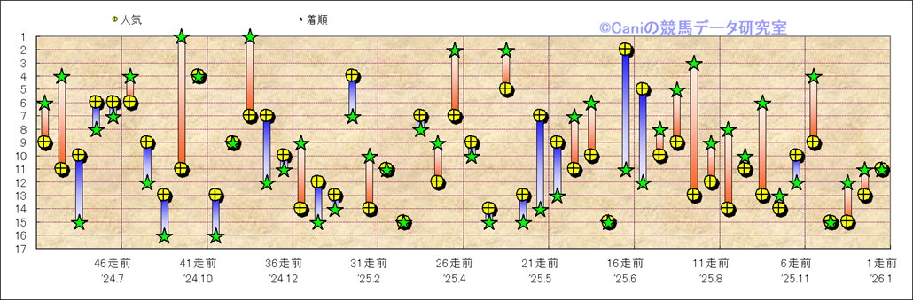 所属馬 近50レースの人気と着順 |