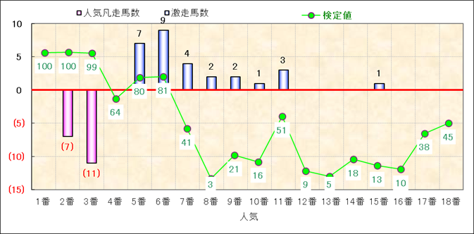 人気凡走馬:1-3番人気で着外、激走馬:5-18番人気で入着 |