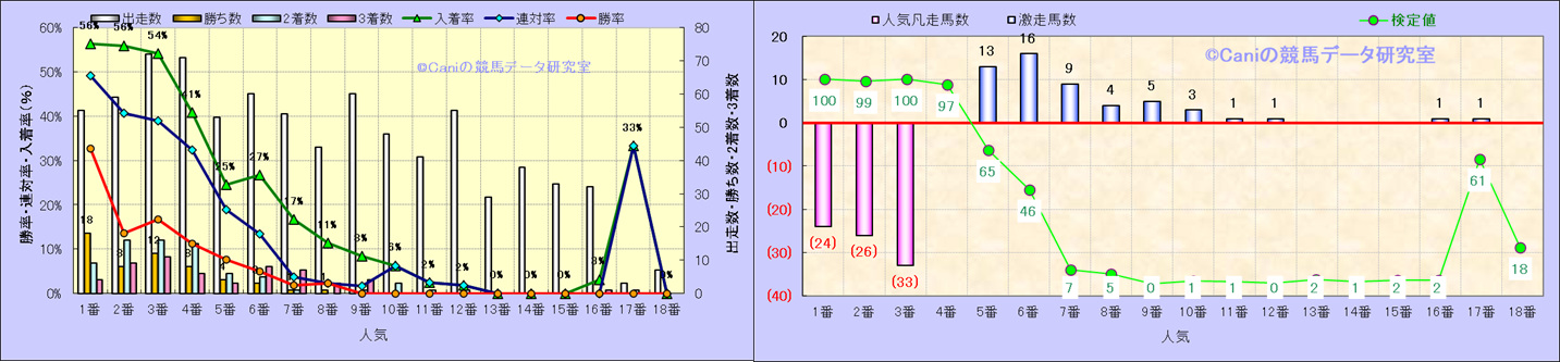人気凡走馬:1-3番人気で着外、激走馬:5-18番人気で入着 |