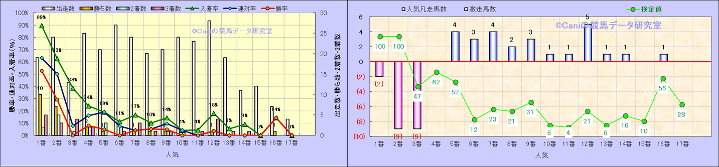 人気凡走馬:1-3番人気で着外、激走馬:5-18番人気で入着 |