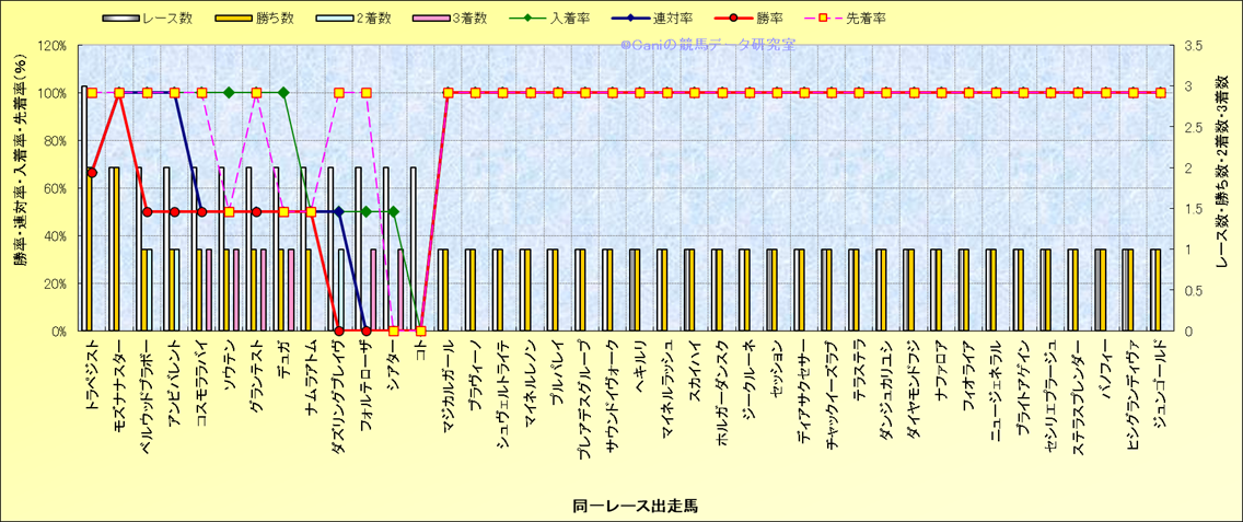 ライバル(相性)解析 同一レースに下記馬が出走した場合の成績とその馬に先着する先着率 |
