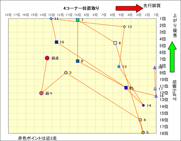 近走における4コーナーでの位置取りと上がり順位(頭数補正後) |