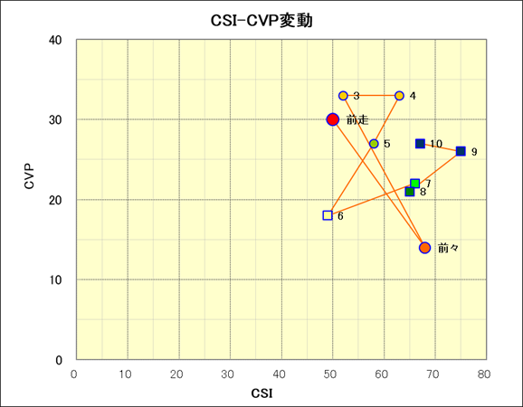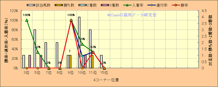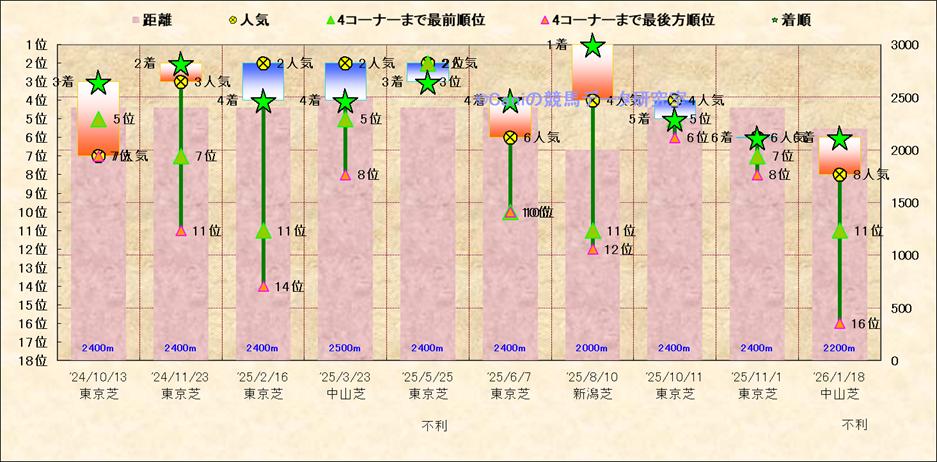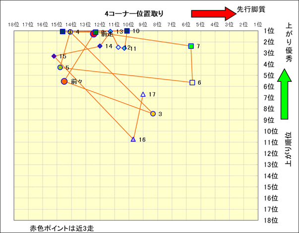 近走における4コーナーでの位置取りと上がり順位(頭数補正後) |