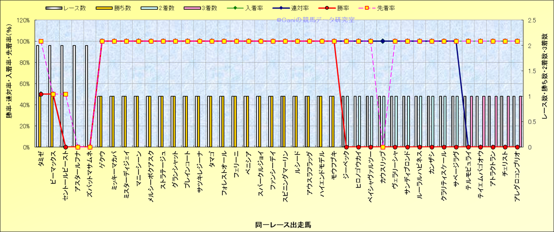 ライバル(相性)解析 同一レースに下記馬が出走した場合の成績とその馬に先着する先着率 |