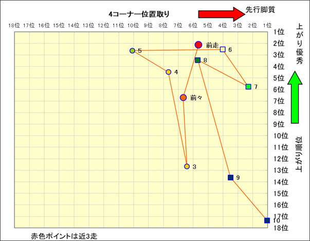 近走における4コーナーでの位置取りと上がり順位(頭数補正後) |