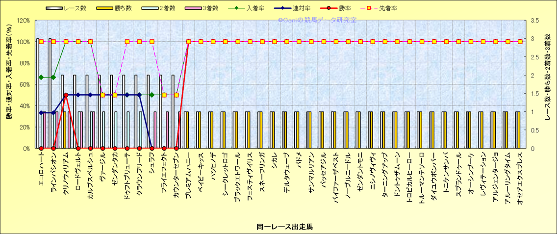 ライバル(相性)解析 同一レースに下記馬が出走した場合の成績とその馬に先着する先着率 |