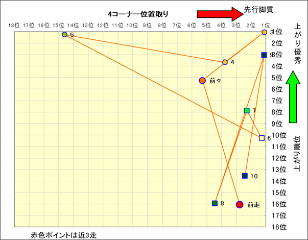 近走における4コーナーでの位置取りと上がり順位(頭数補正後) |