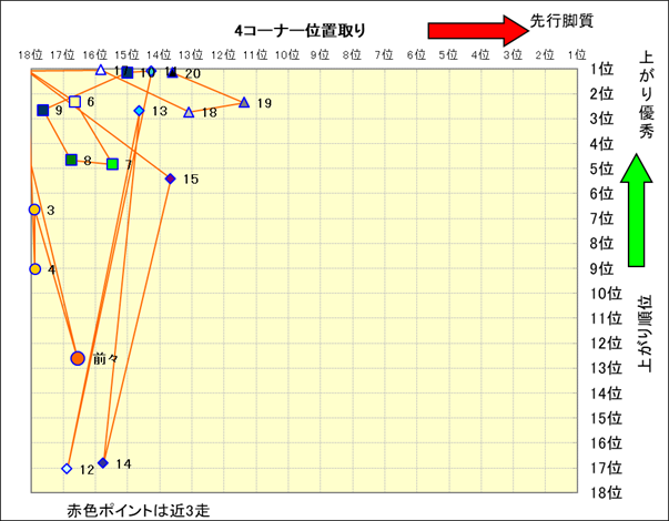 脚質解析 近20レースの4コーナーでの位置取りと上がり順位(頭数補正後) |