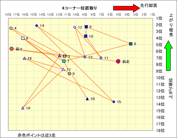 脚質解析 近20レースの4コーナーでの位置取りと上がり順位(頭数補正後) |