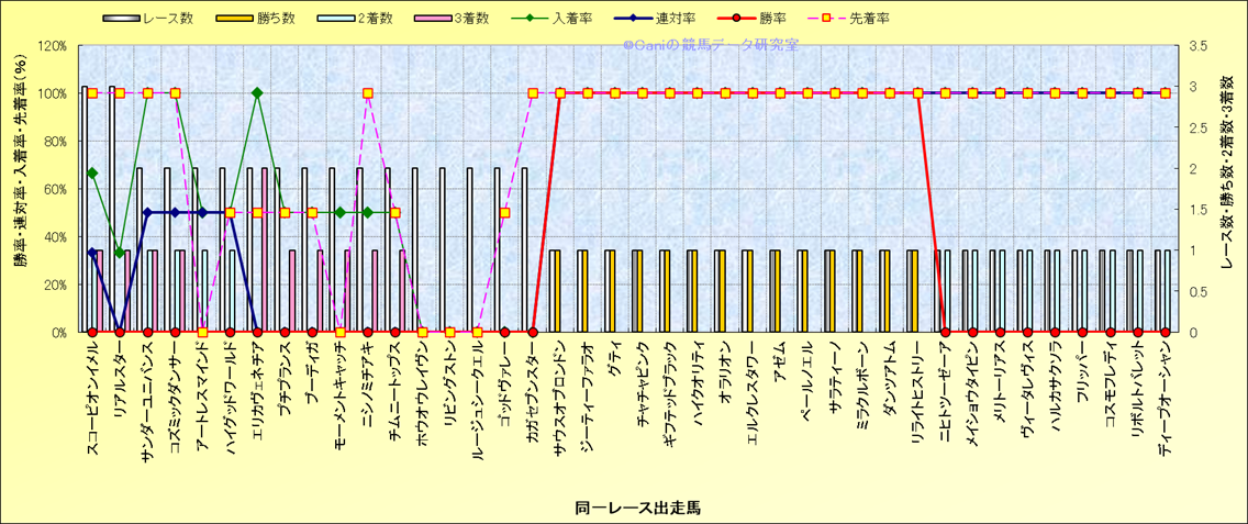ライバル(相性)解析 同一レースに下記馬が出走した場合の成績とその馬に先着する先着率 |