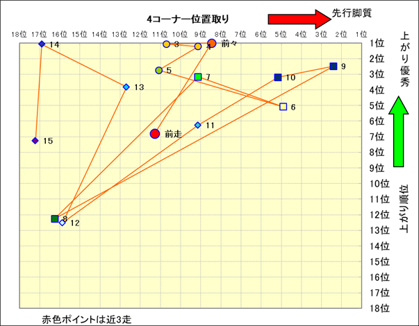 近走における4コーナーでの位置取りと上がり順位(頭数補正後) |