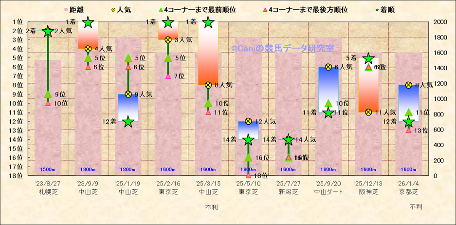 脚質解析 近20レースの4コーナーでの位置取りと上がり順位(頭数補正後) |