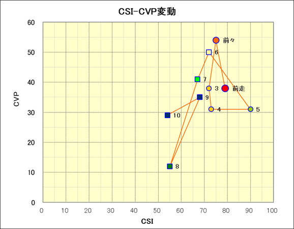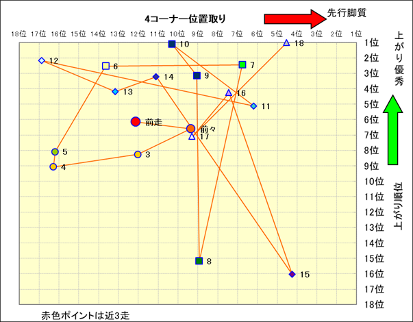 近走における4コーナーでの位置取りと上がり順位(頭数補正後) |