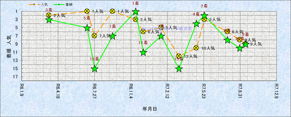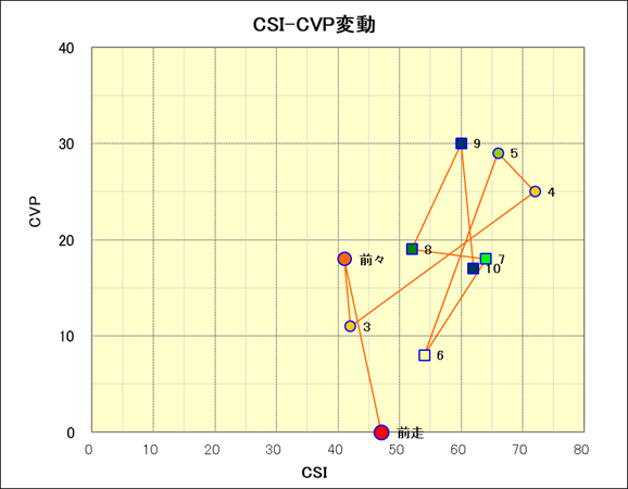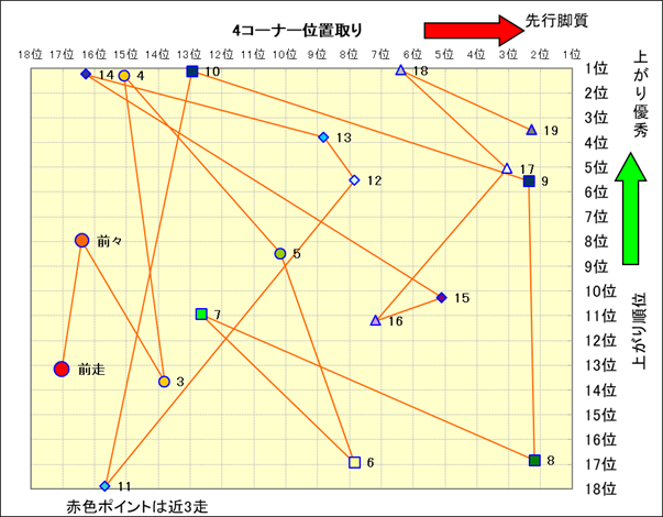 近走における4コーナーでの位置取りと上がり順位(頭数補正後) |