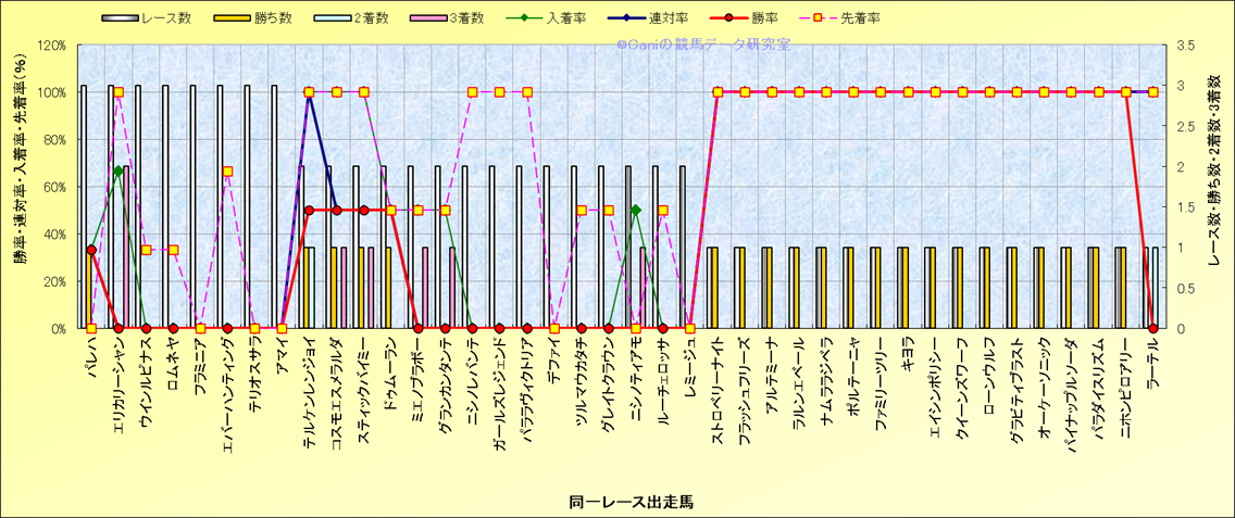 ライバル(相性)解析 同一レースに下記馬が出走した場合の成績とその馬に先着する先着率 |