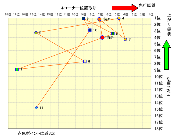 近走における4コーナーでの位置取りと上がり順位(頭数補正後) |