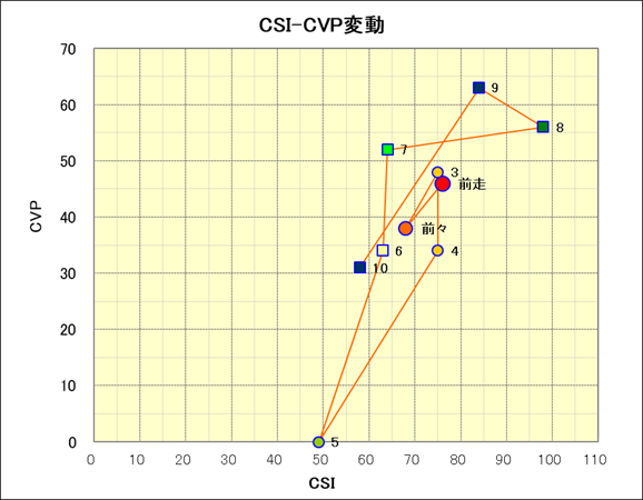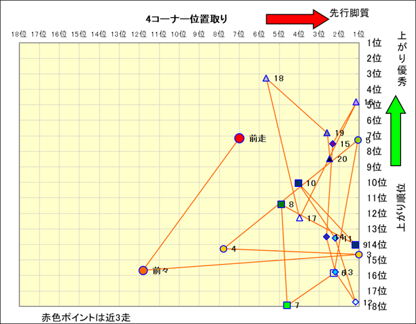近走における4コーナーでの位置取りと上がり順位(頭数補正後) |