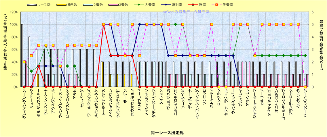 ライバル(相性)解析 同一レースに下記馬が出走した場合の成績とその馬に先着する先着率 |