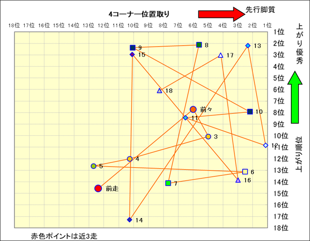 近走における4コーナーでの位置取りと上がり順位(頭数補正後) |