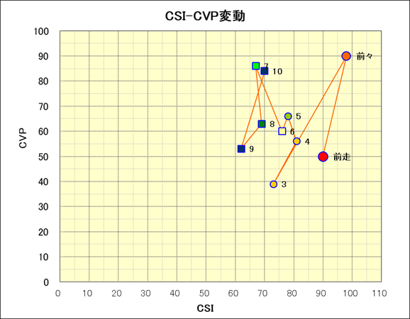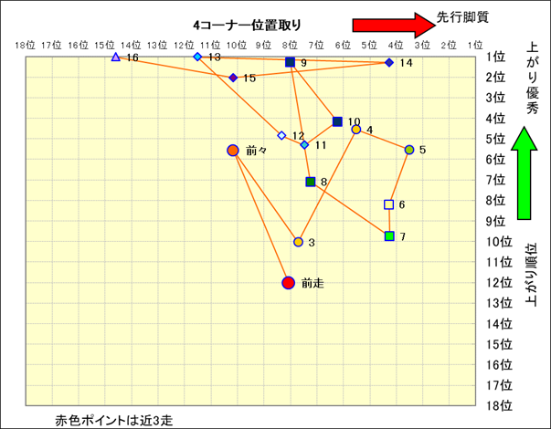 近走における4コーナーでの位置取りと上がり順位(頭数補正後) |