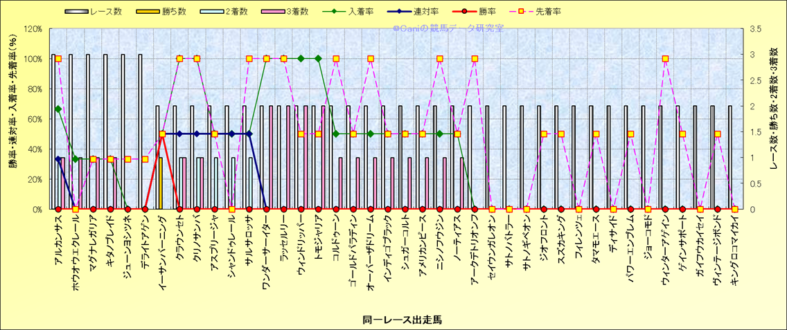 ライバル(相性)解析 同一レースに下記馬が出走した場合の成績とその馬に先着する先着率 |