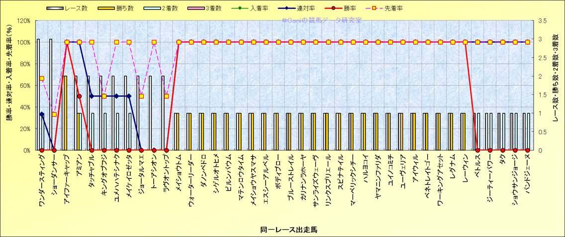 ライバル(相性)解析 同一レースに下記馬が出走した場合の成績とその馬に先着する先着率 |