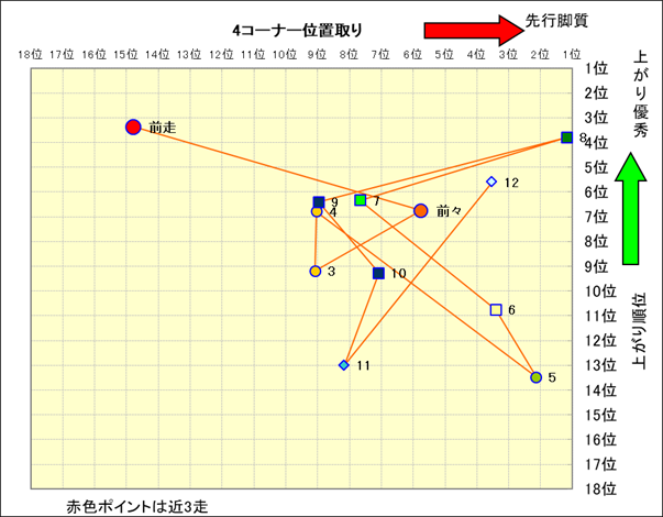 近走における4コーナーでの位置取りと上がり順位(頭数補正後) |
