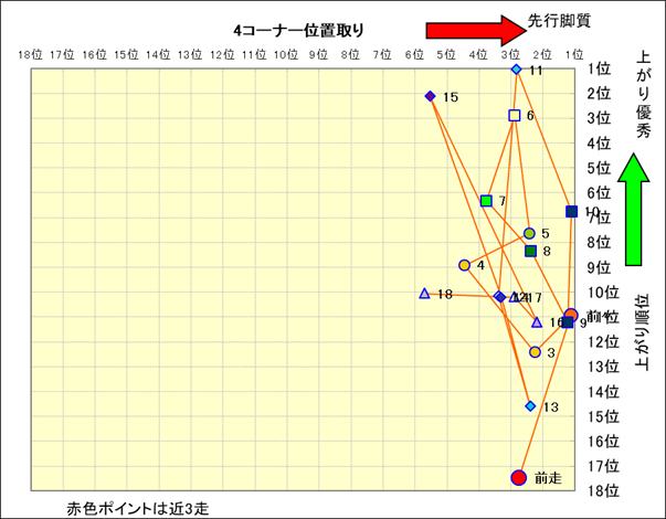 脚質解析 近20レースの4コーナーでの位置取りと上がり順位(頭数補正後) |