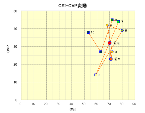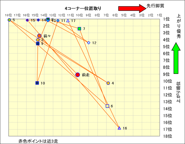 近走における4コーナーでの位置取りと上がり順位(頭数補正後) |