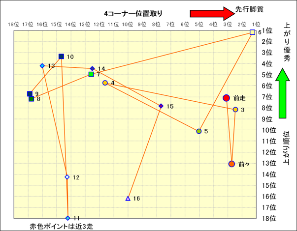 近走における4コーナーでの位置取りと上がり順位(頭数補正後) |