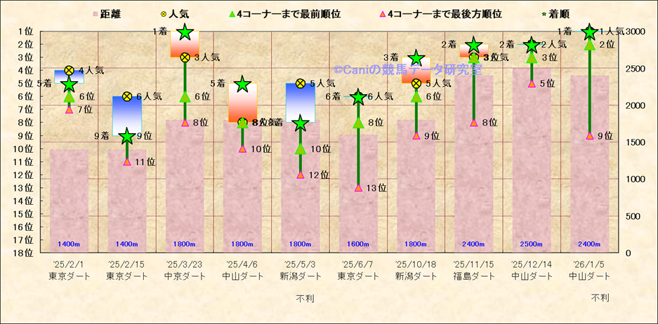 脚質解析 近20レースの4コーナーでの位置取りと上がり順位(頭数補正後) |