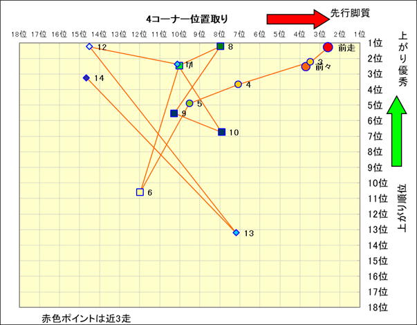 近走における4コーナーでの位置取りと上がり順位(頭数補正後) |