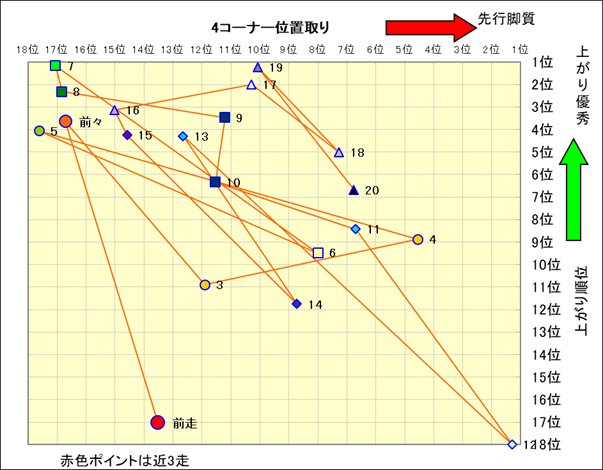 脚質解析 近20レースの4コーナーでの位置取りと上がり順位(頭数補正後) |