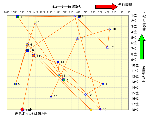 脚質解析 近20レースの4コーナーでの位置取りと上がり順位(頭数補正後) |