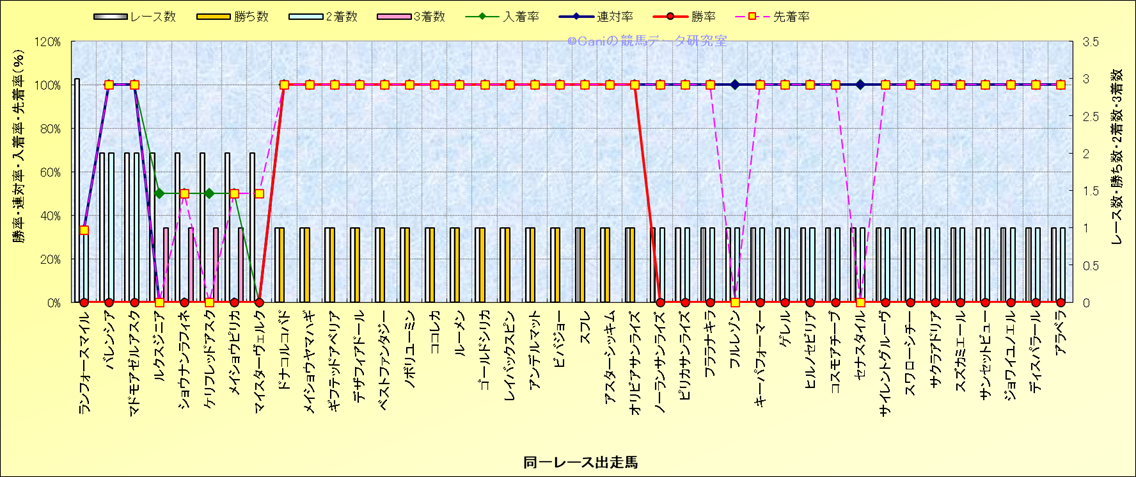 ライバル(相性)解析 同一レースに下記馬が出走した場合の成績とその馬に先着する先着率 |