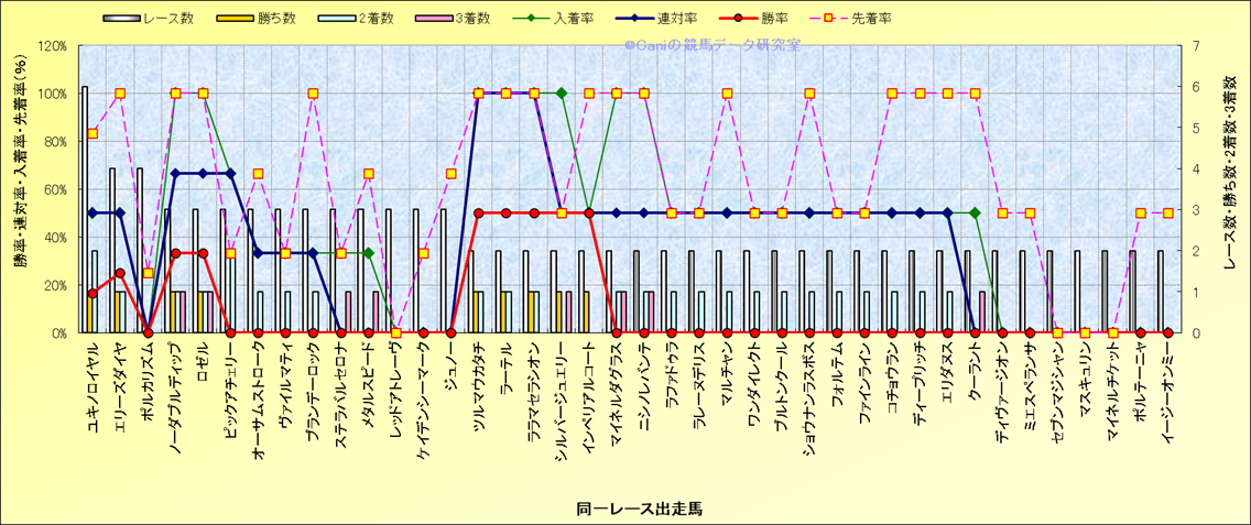 ライバル(相性)解析 同一レースに下記馬が出走した場合の成績とその馬に先着する先着率 |