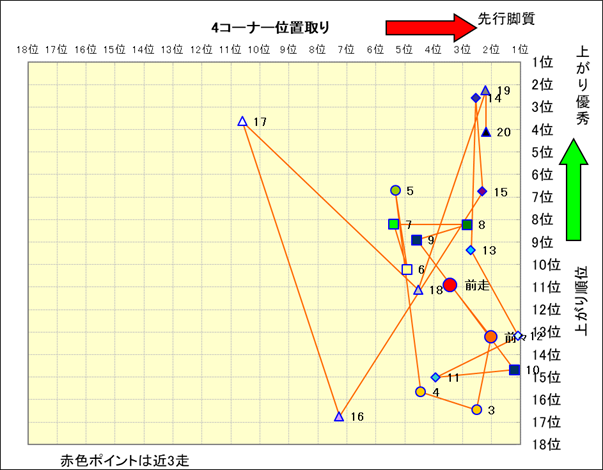 脚質解析 近20レースの4コーナーでの位置取りと上がり順位(頭数補正後) |