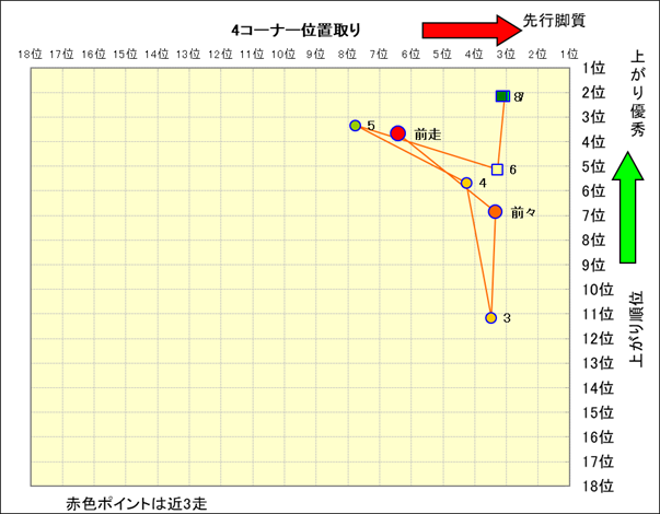近走における4コーナーでの位置取りと上がり順位(頭数補正後) |