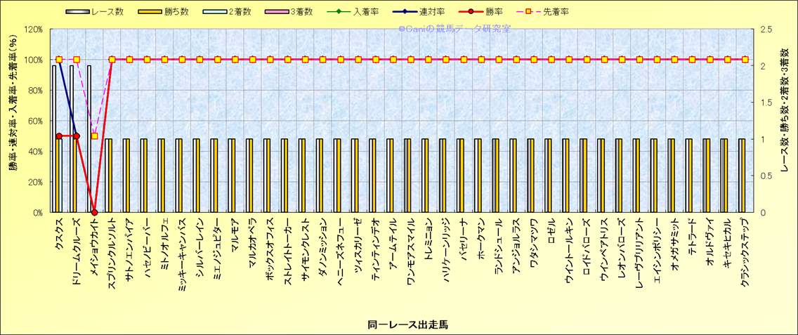 ライバル(相性)解析 同一レースに下記馬が出走した場合の成績とその馬に先着する先着率 |