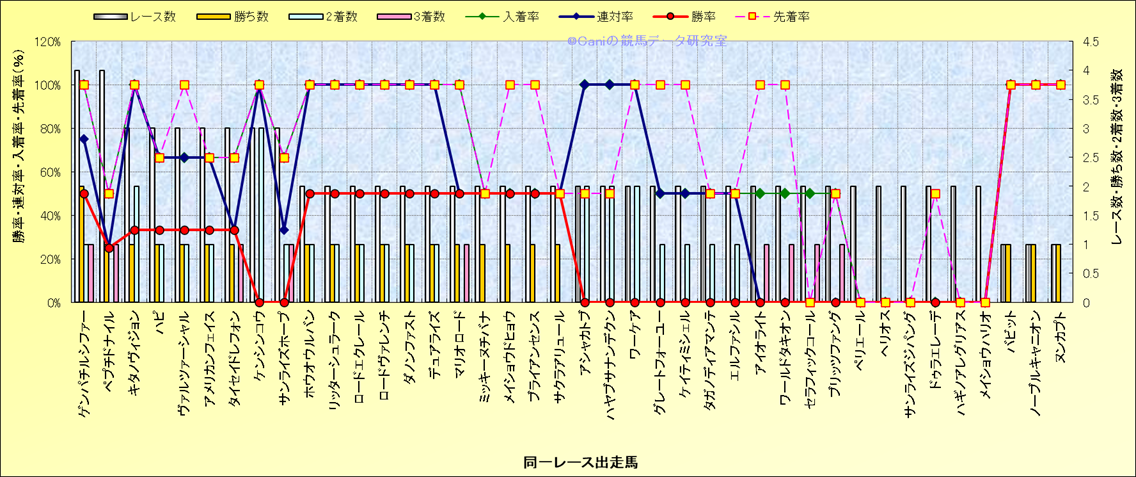 ライバル(相性)解析 同一レースに下記馬が出走した場合の成績とその馬に先着する先着率 |