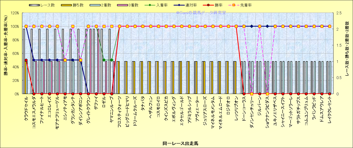 ライバル(相性)解析 同一レースに下記馬が出走した場合の成績とその馬に先着する先着率 |