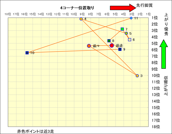 近走における4コーナーでの位置取りと上がり順位(頭数補正後) |