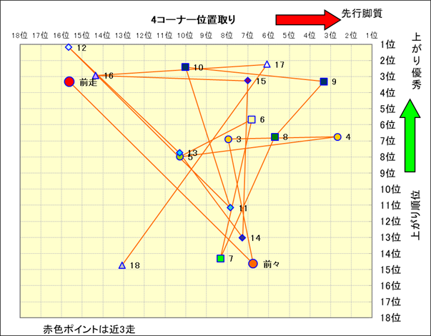 近走における4コーナーでの位置取りと上がり順位(頭数補正後) |