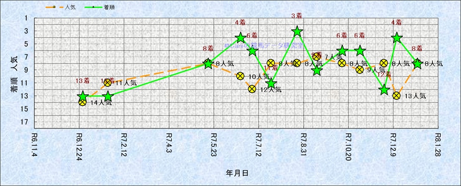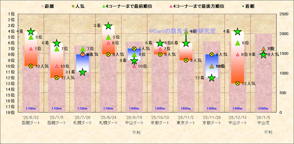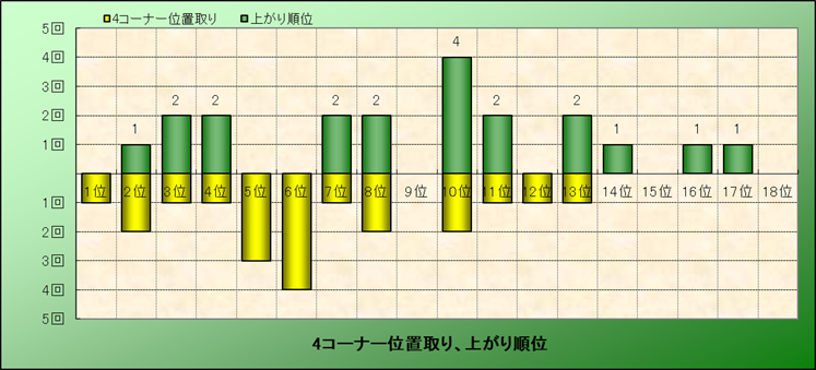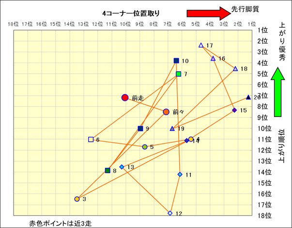 脚質解析 近20レースの4コーナーでの位置取りと上がり順位(頭数補正後) |