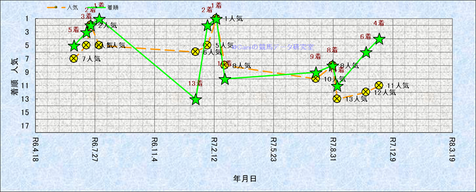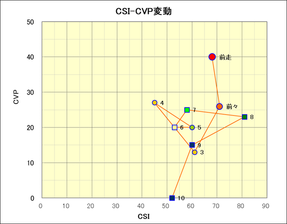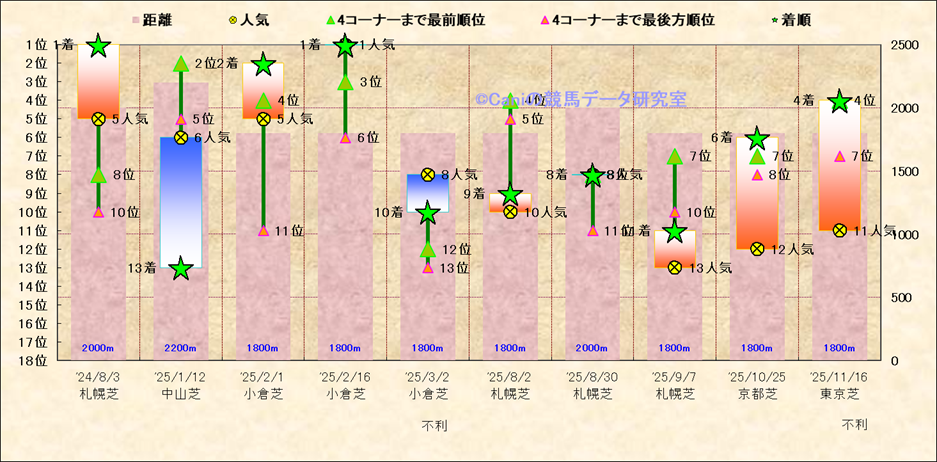 近走における4コーナーでの位置取りと上がり順位(頭数補正後) |