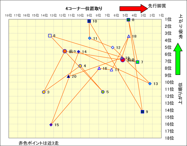 脚質解析 近20レースの4コーナーでの位置取りと上がり順位(頭数補正後) |