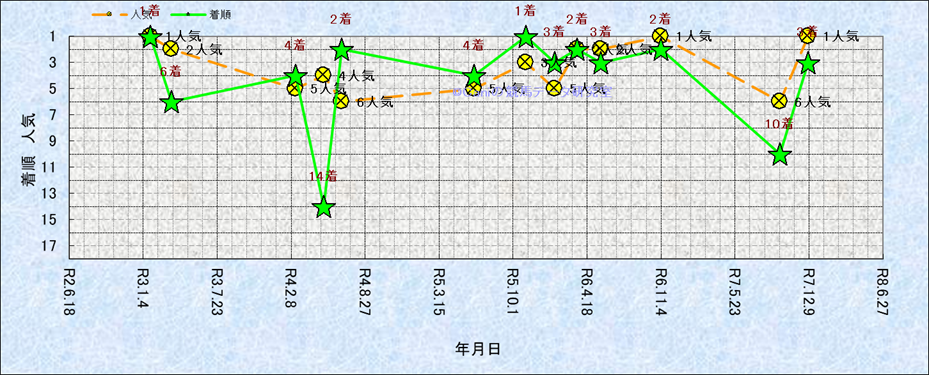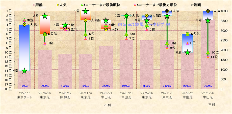 脚質解析 近20レースの4コーナーでの位置取りと上がり順位(頭数補正後) |