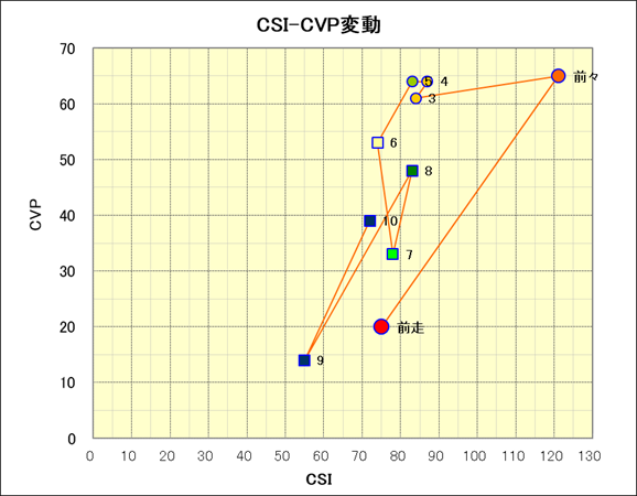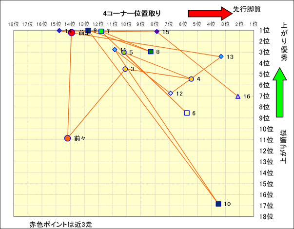 近走における4コーナーでの位置取りと上がり順位(頭数補正後) |