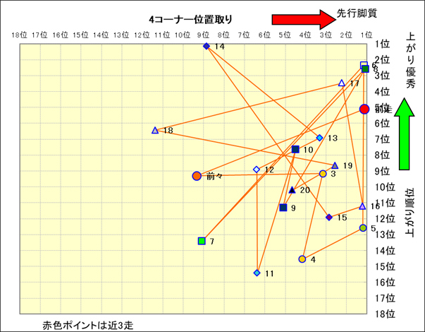 脚質解析 近20レースの4コーナーでの位置取りと上がり順位(頭数補正後) |