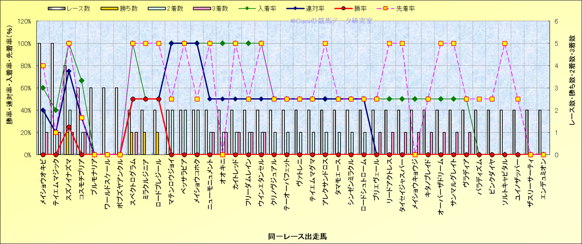 ライバル(相性)解析 同一レースに下記馬が出走した場合の成績とその馬に先着する先着率 |